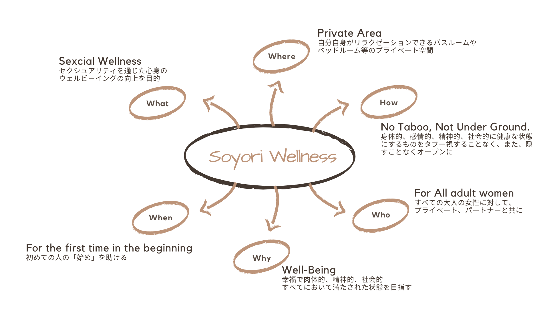 Product details「Soyori Wellness」 は、人々のセクシュアリティに対する身体的、感情的、精神的、社会的にも健康な状態をサポートするとともに、心身のウェルビーイングの向上=肉体的的、精神的、社会に幸福ですべてにおいて満たされた状態の向上を目指します。